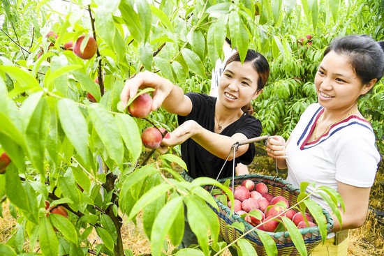 5月27日,游人在渝水区水北镇水北村盛跃农业开发有限公司的桃林里采摘鲜桃。